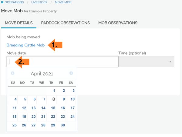 Click on the drop down menu under 'Paddock/pasture moved to' (4)