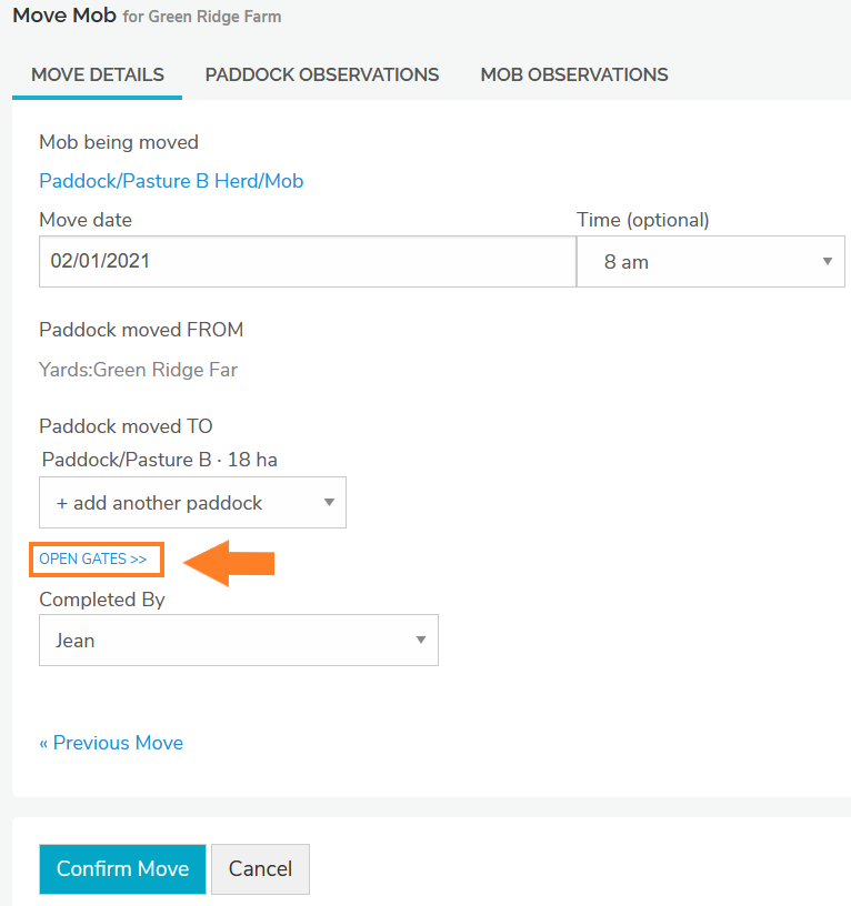 With multiple paddocks selected in Move Details screen the link to the open gates feature becomes available.