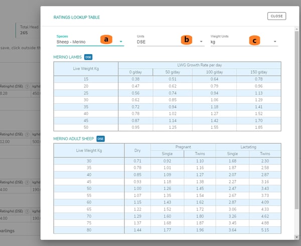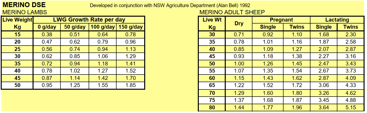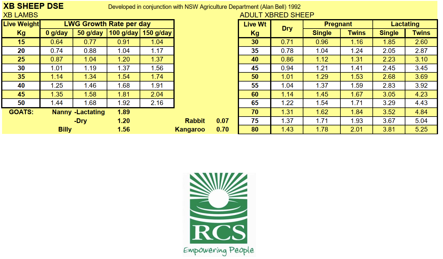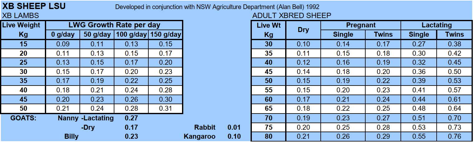 For sheep, the standard animal unit is the Dry Sheep Equivalent (DSE). This is the feed required to maintain a 50 kg wether with no weigh gain.