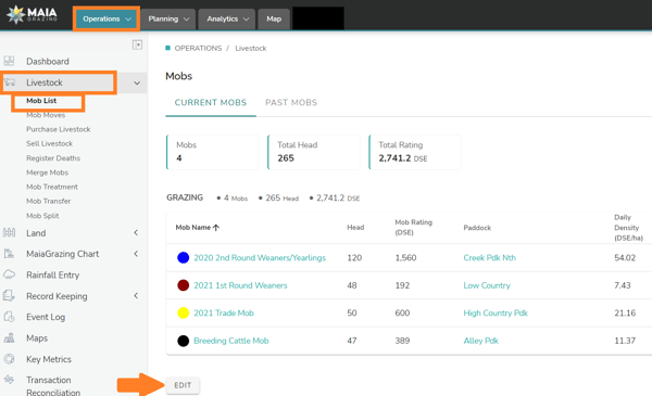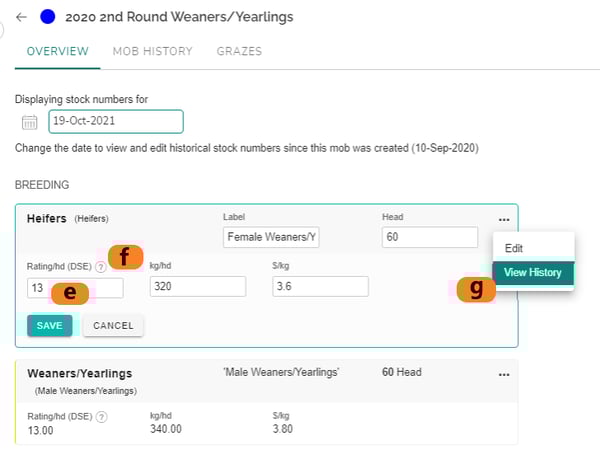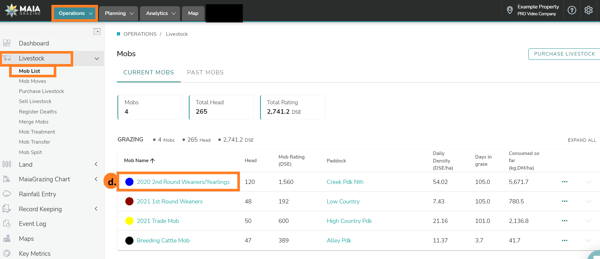 Click on the relevant Mob/ herd name (d) to open the Mob Management page