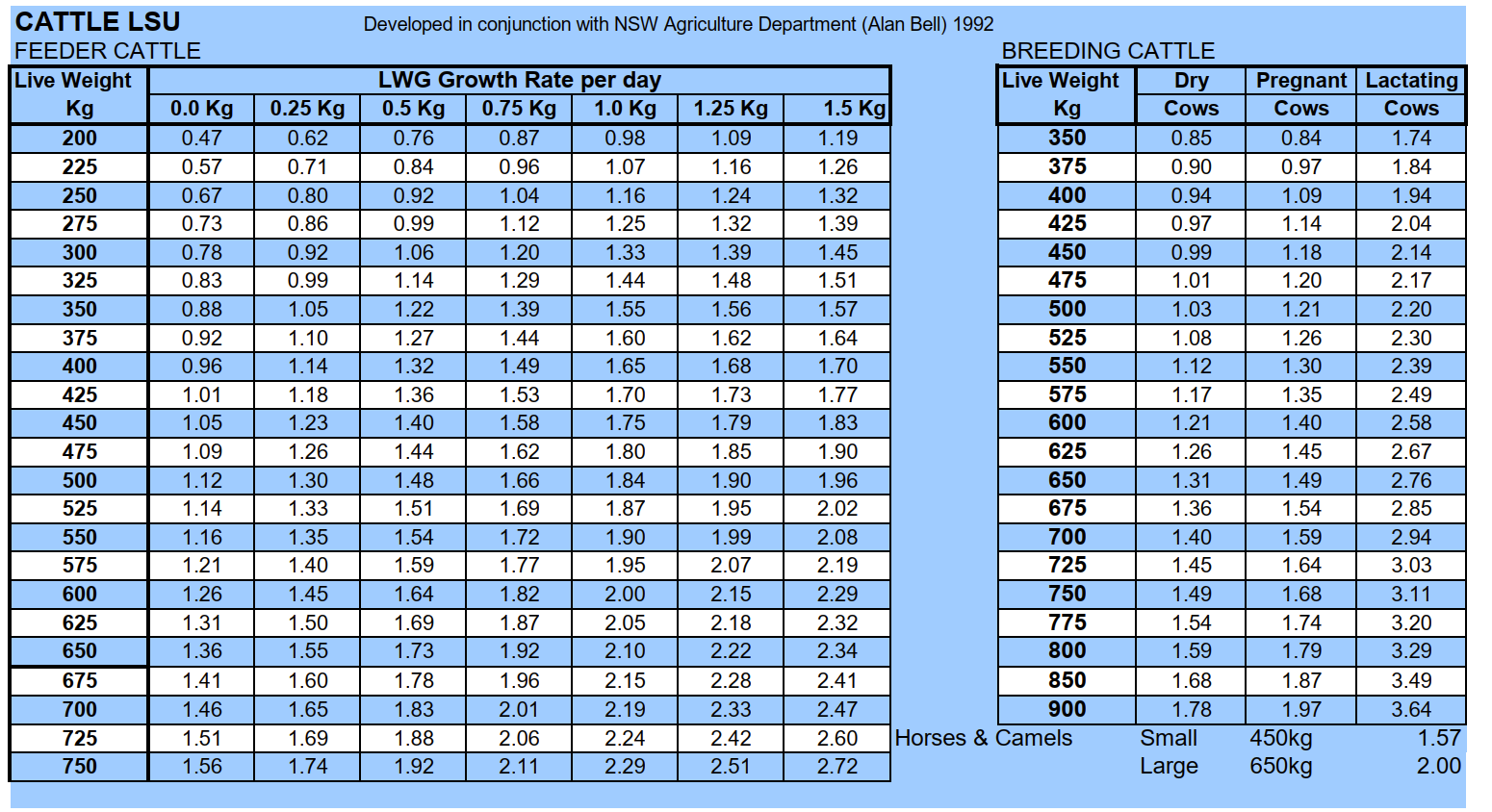 For cattle, the standard animal unit is the Large Stock Unit (LSU). This is the feed required to maintain a 450 kg Steer with no weight gain.