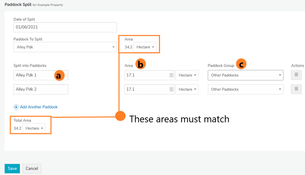 • Click into the text box under 'Split into Paddocks/Pastures' (a)