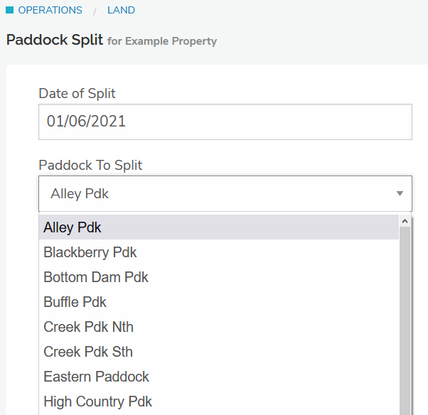 • Click on the drop-down box under 'Paddock/Pasture To Split'.
