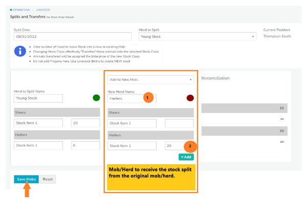 Type the number of head to be split into the New Mob/Herd from each stock class. (2.)