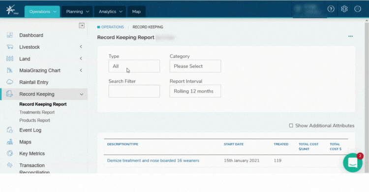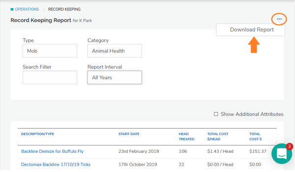 Reports for mob/herd and paddock/pasture treatments can be generated for custom dates and exported in CSV format