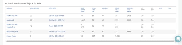Grazes are displayed in chronological order from the most recent entry date to oldest entry date.