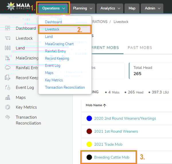 Click on 'Livestock' from the left hand menu to open your mob/herd list (2.)