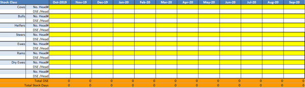 In the white rows you enter the stock unit rating, which will change as the weight and reproductive status of the animal changes through the year.