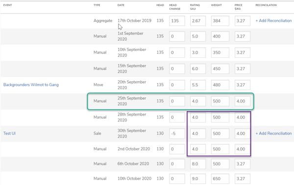 When editing ratings, weight or price in the mob details page, you can update it for that date only, or carry forward the edit to today.
