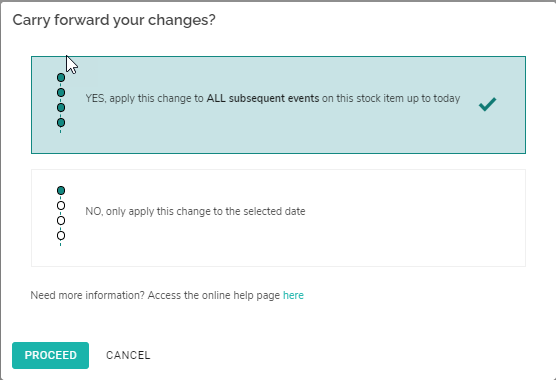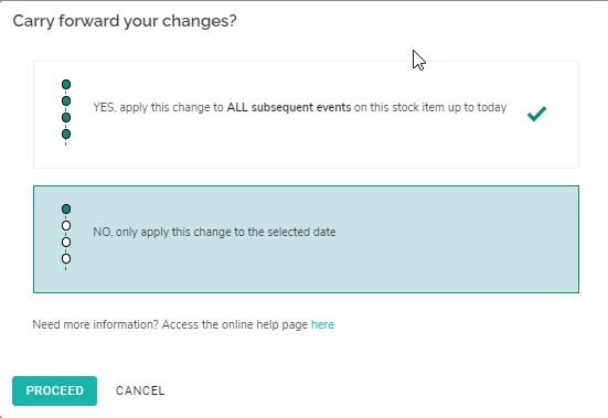 Yes, apply this change to ALL subsequent events on this stock item up to Today, is the default option, which when selected will override all the subsequent records on the stock item history from the selected date until today for all of Rating, Weight and Price. Future dated records will not be updated with these changes.