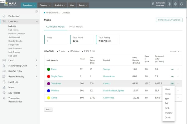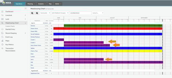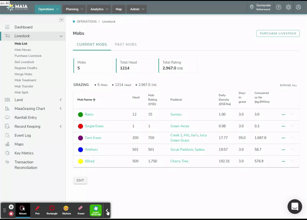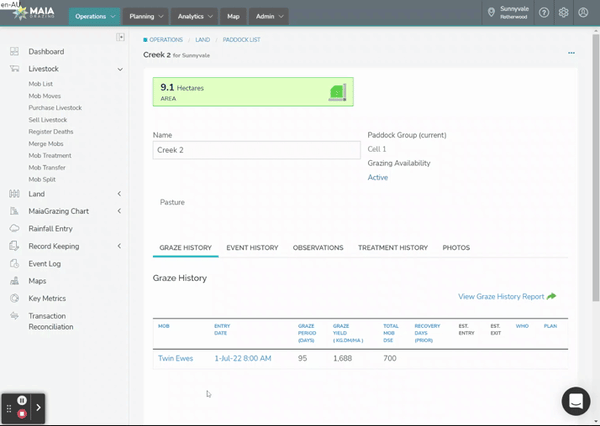 Your lambing ewes are now recorded on Maia Grazing as grazing across multiple paddocks. Maia will use averages to record your grazing density for this period.