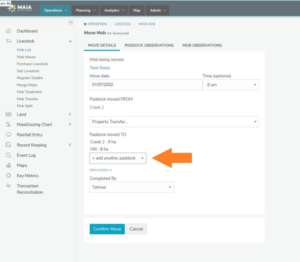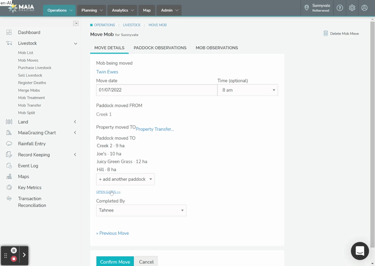 Once lambing is finished and you wish to mob your ewes and lambs up together, you can do this by editing the move and using the closing the gates feature.