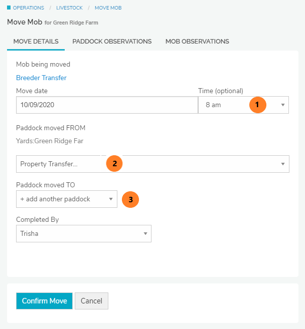 Click on the dropdown box under 'Paddock/pasture moved TO' (3).