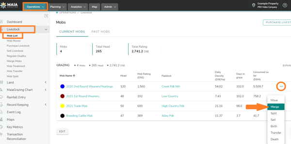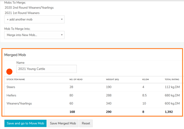 Select the name of the mob from the list that you want the previous mobs to be merged INTO. Or you can choose to create a new mob/herd with the merged stock.