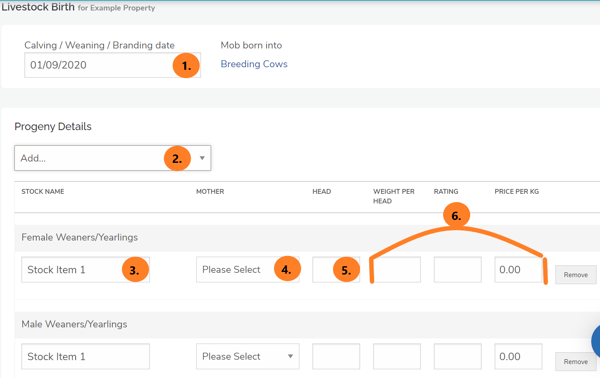 Enter more animals to the birth event if required by click on the “Add” drop down box and following steps 3 - 6 again.