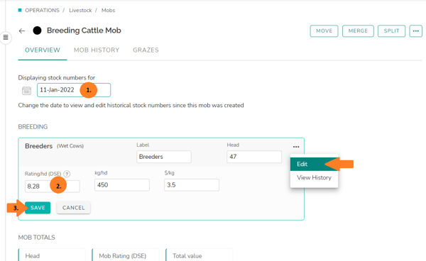 - Click on the dropdown box that says 'Add to New or Existing Herd/Mob' and select 'Add to New Herd/Mob' (1)