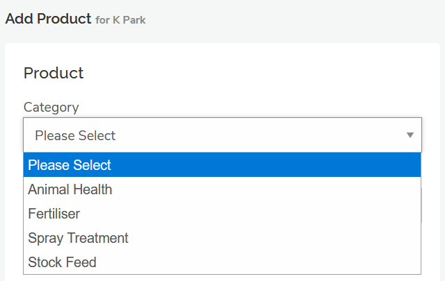 You can choose from Animal Health, Fertiliser, Spray Treatment, or Stock Feed.